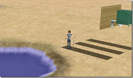 Since constantly going from place to place Downtown slows up my game and got me bored out of my mind waiting for each to load, I decided to build him a little pond and a garden, a single wall, a toilet, and a cheap sink. He will try to live off the land. I left him with 100 simoleon.